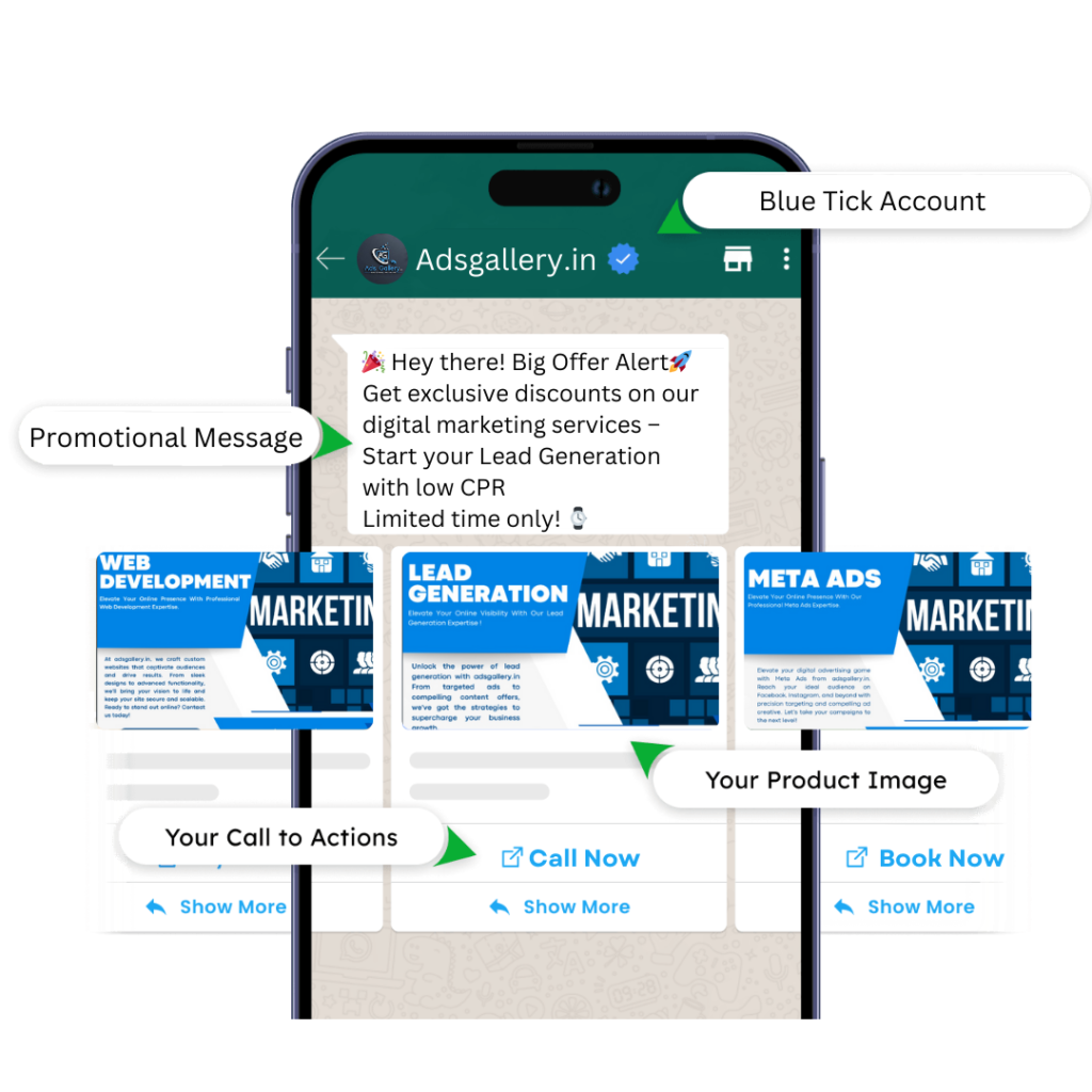 Share promotions, discounts, carousel ads, and more – hassle-free and effective!